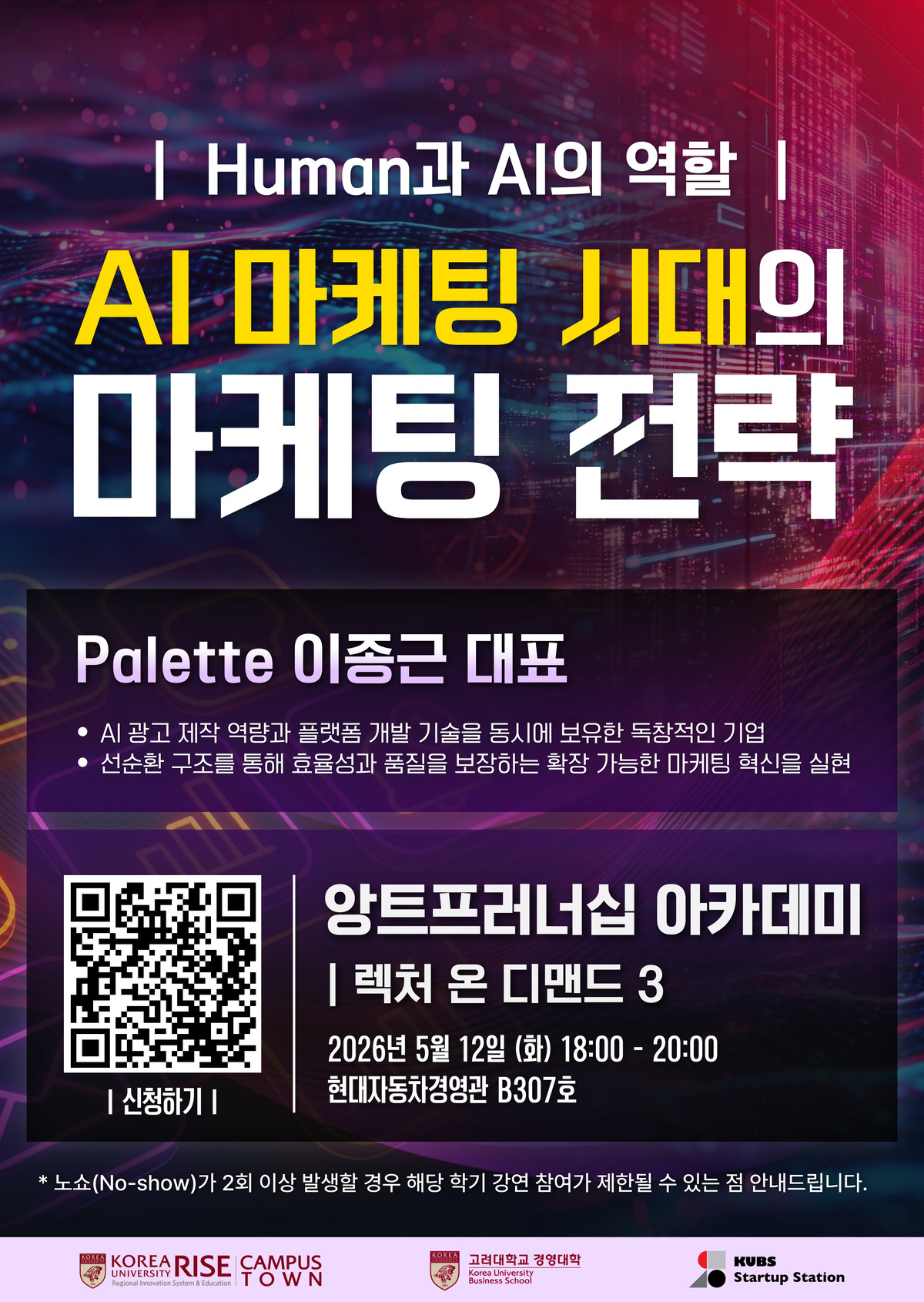 5/12(화)에 있을, 2026학년도 1학기 앙트프러너십 아카데미: 렉처 온 디맨드3에 대해 안내드립니다.