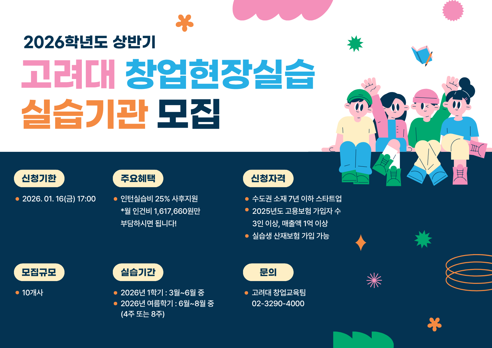고려대학교에서는 유망 스타트업과 함께하는 2026학년도 상반기 창업현장실습 프로그램을 운영합니다.
