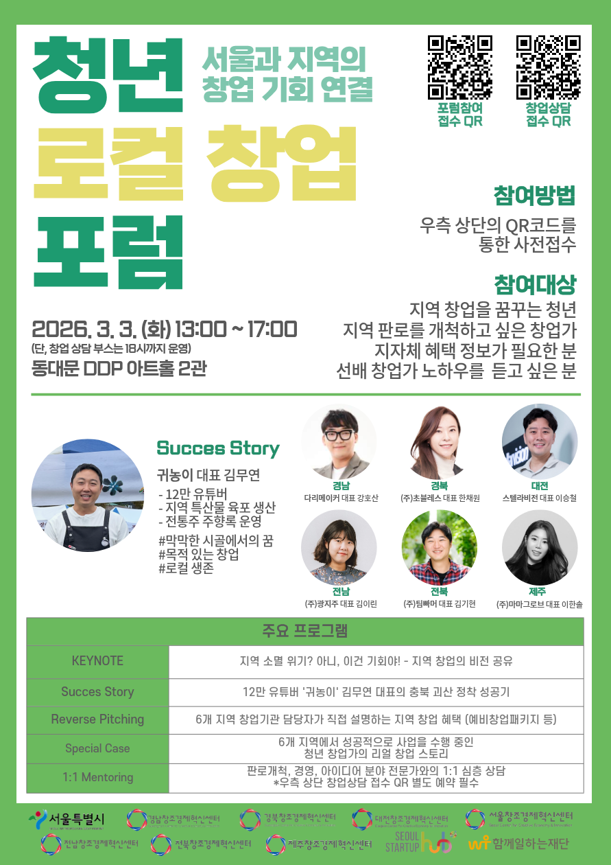 서울과 지역의 창업 기회를 연결할 수 있는 청년 로컬 창업 포럼을 개최합니다! <행사개요>ㅇ 행사명 : 청년 로컬 창업 포럼ㅇ 일시 : '26.3.3.(화) 13:00~17:00ㅇ 장소 : 동대문 DDP 아트홀 2관ㅇ 대상 : 지역 창업을 꿈꾸거나 관심이 있으신 분ㅇ 참여방법 : 포스터의 QR코드를 통한 사전접수 관심있는 분들의 많은 참여 부탁드립니다.